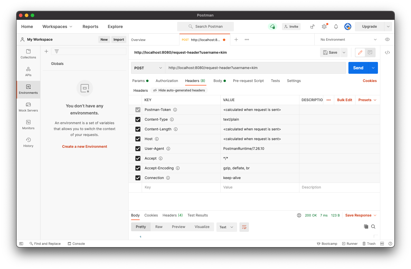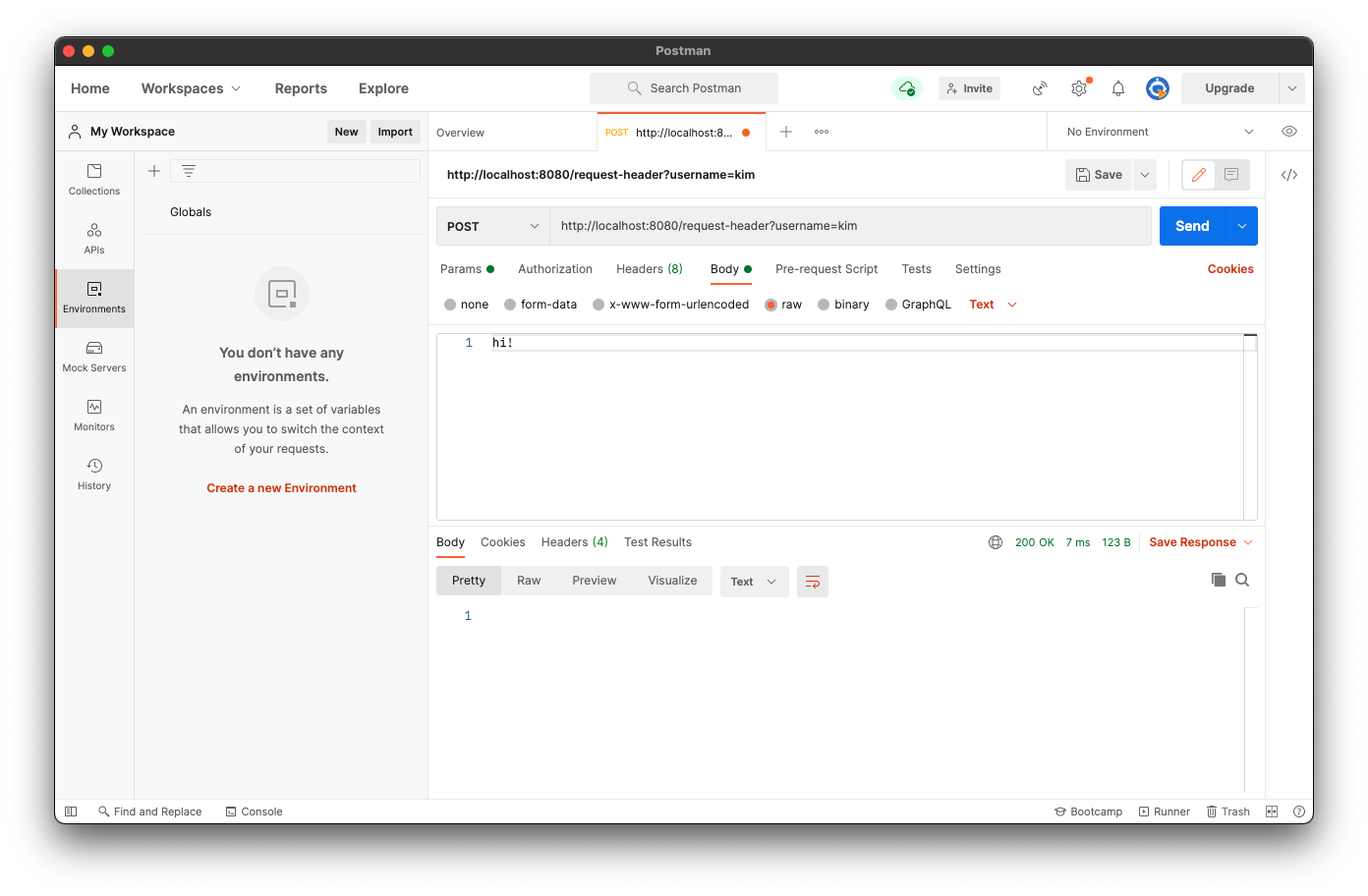 포스트맨으로 post방식으로 해당 url에 body에 hi!라고 입력을 하면 자동으로 헤더정보가 세팅된다.
