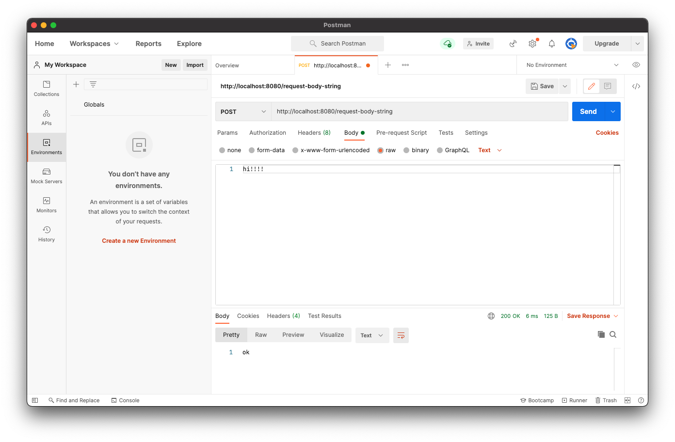 RequestBodyStringServlet 이라는 클래스를 생성하고 서비스를 띄운다