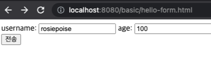 서비스를 띄우고 http://localhost:8080/basic/hello-form.html에서 내용을 작성하고 전송버튼을 클릭한다.