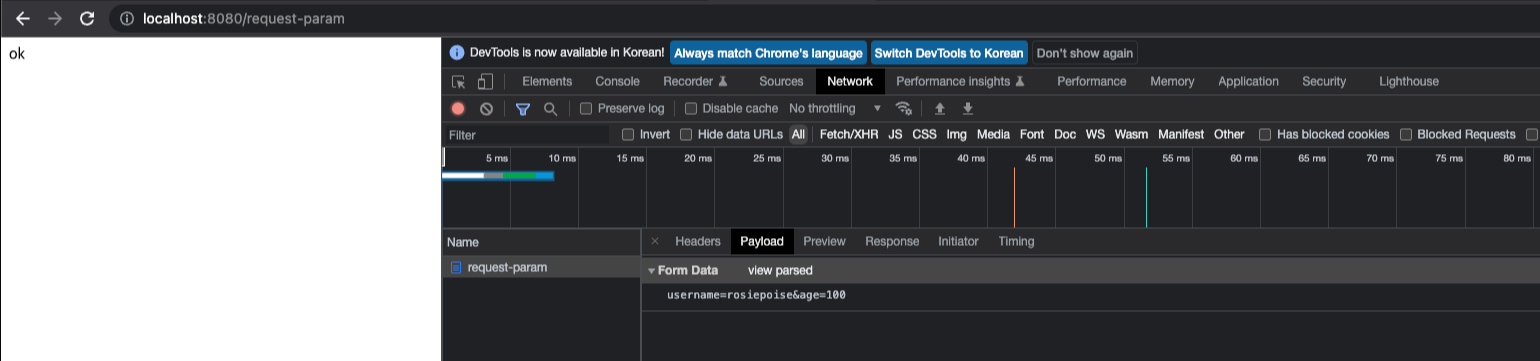 - 메세지바디에 쿼리파라미터 형식으로 데이터를 전달 username=rosieposie&age=22