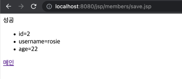 http://localhost:8080/jsp/members/new-form.jsp 실행하고 정보 입력 후 전송하면 save.jsp로 넘어감!