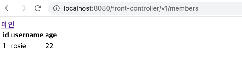 http://localhost:8080/front-controller/v1/members 목록 조회 실행 결과