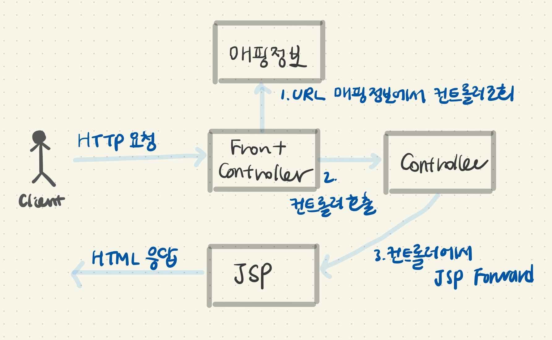 - 프론트 컨트롤러는 이 인터페이스를 호출하여 구현과 관계없이 로직의 일관성을 가져갈 수 있음