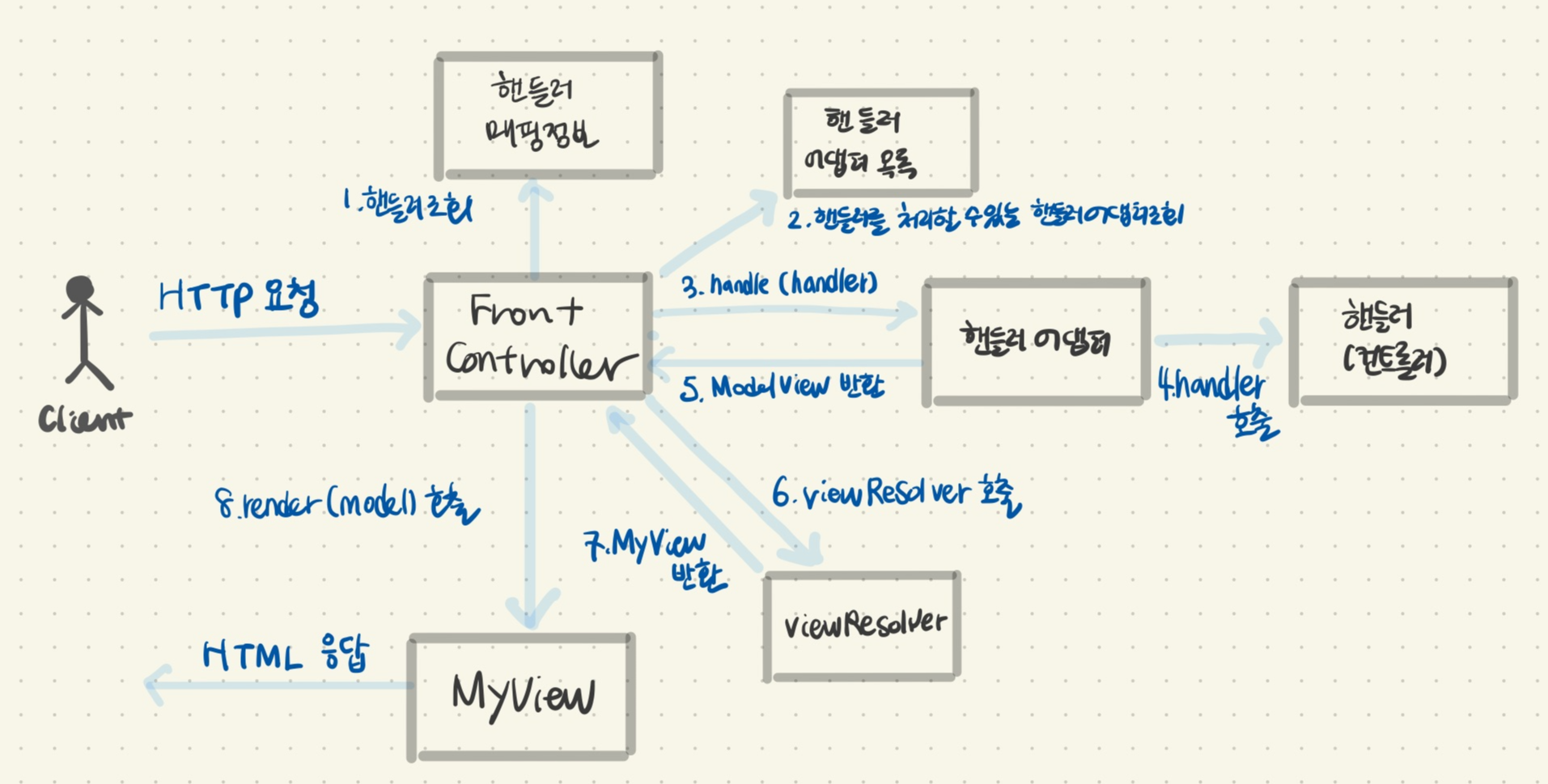 - 핸들러 : 컨트롤러의 이름은 더 넓은 범위인 핸들러로 변경했다. 그 이유는 이제 어댑터가 있기 때문에 꼭 컨트롤러의 개념 뿐 아니라 어떤 것이든 해당하는 종류의 어댑터만 있으면 모두 처리가 가능하기 때문이다.