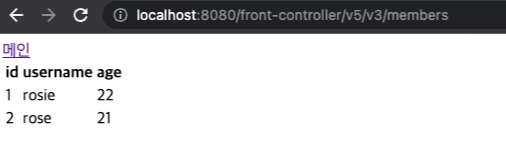 http://localhost:8080/front-controller/v5/v3/members/members 목록 조회 실행 결과