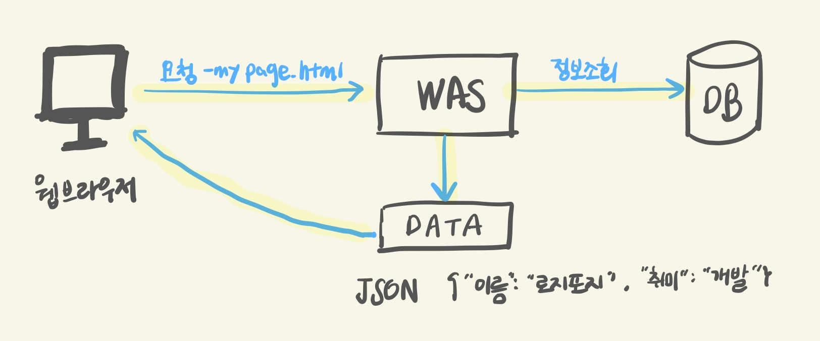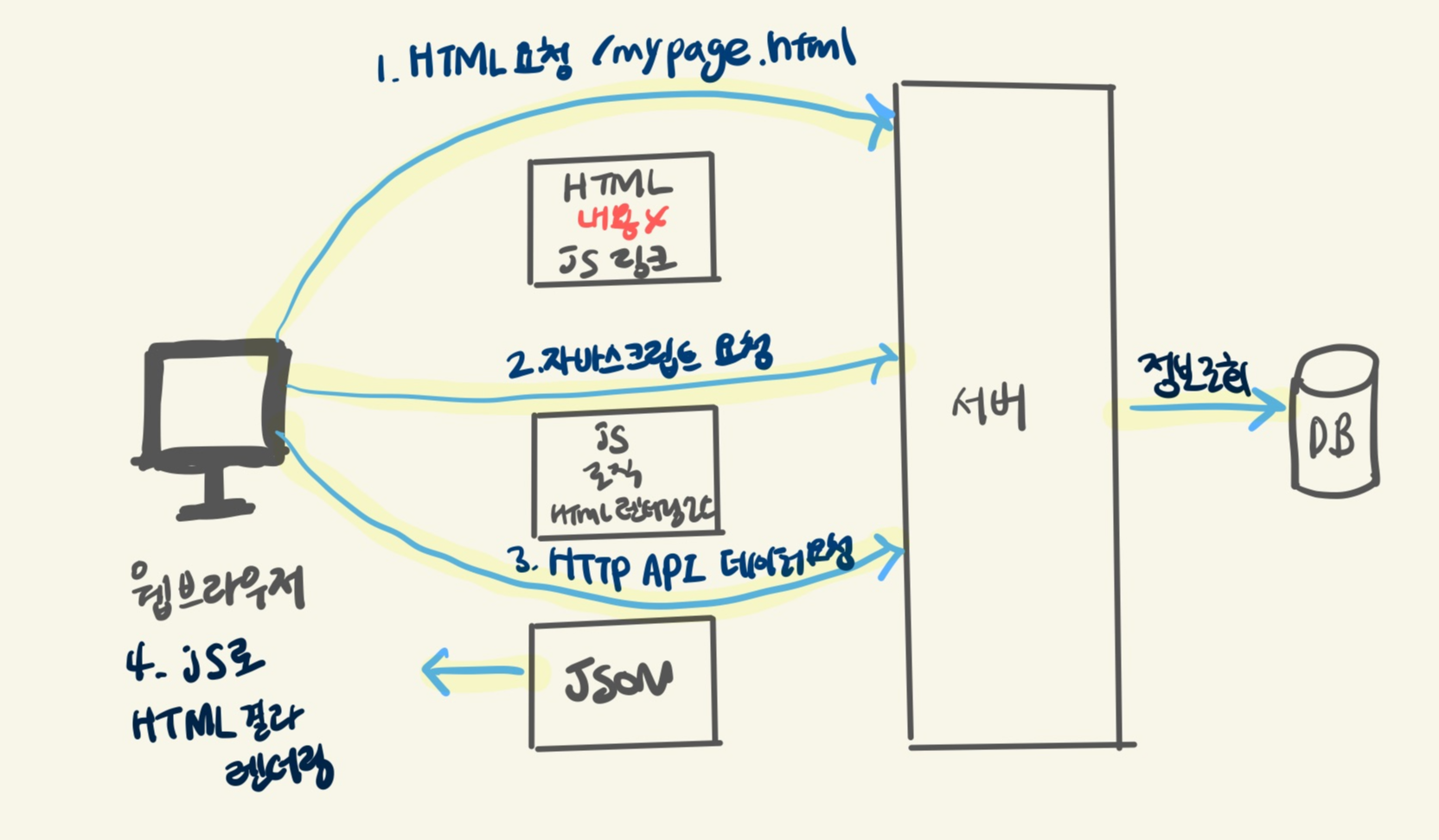 웹브라우저 요청시 서버에서는 필요한 데이터를 모두 가져와서 html파일을 만들고, html 파일을 동적으로 제어할 수 있는 소스코드와 함께 클라이언트에게 보내준다. 클라이언트에서는 동적으로 만들어진 html파일을 바로 사용자에게 보여준다.