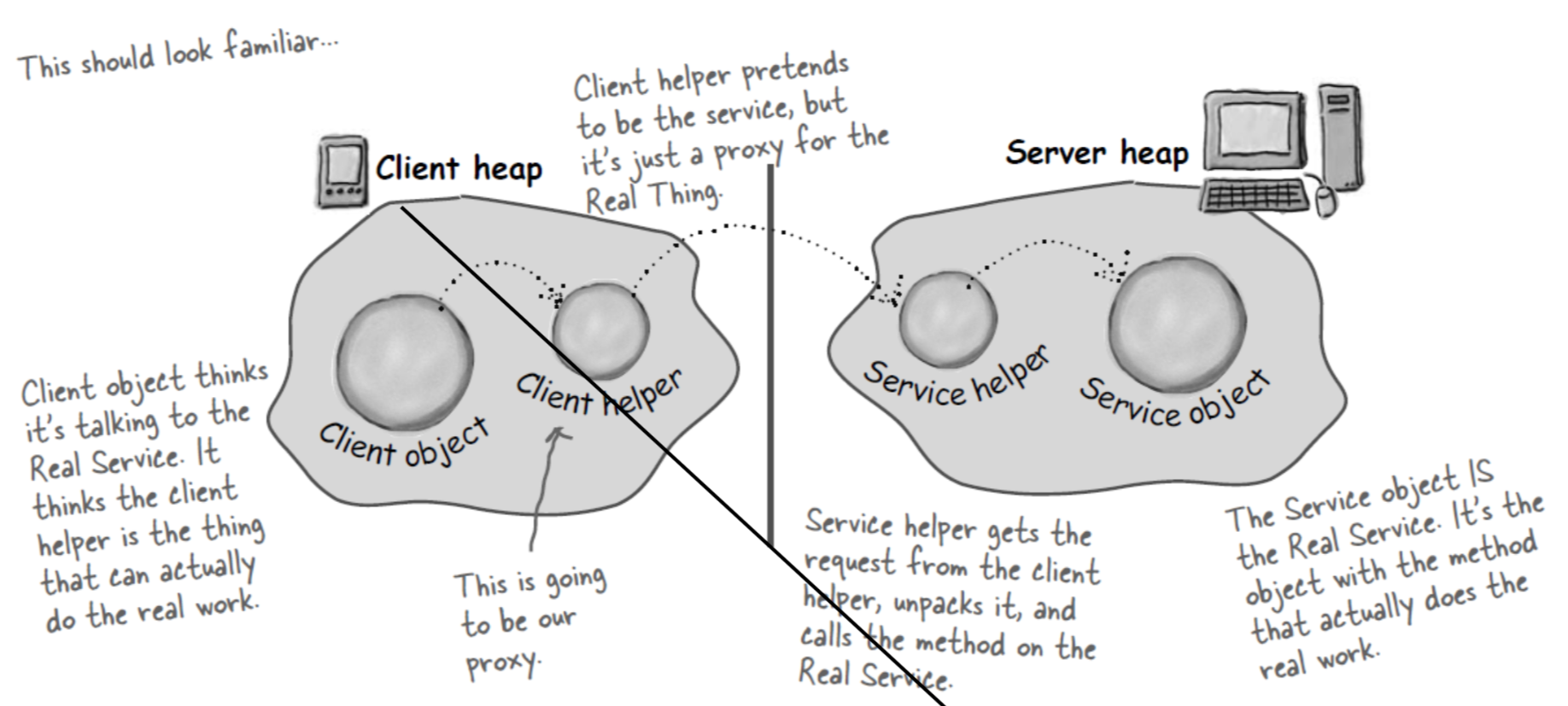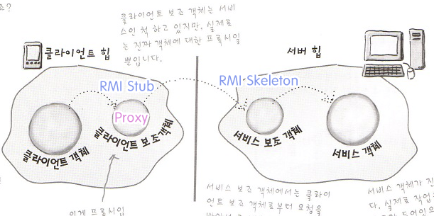 - 프록시를 활용하는 객체로, 원격 객체의 메소드를 호출하는 것처럼 행동한다. 하지만 실제로는 로컬 힙에 들어있는 '프록시'객체의 메소드를 호출하며, 네트워크 통신과 관련된 저수준 작업은 이 프록시 객체에서 처리한다.