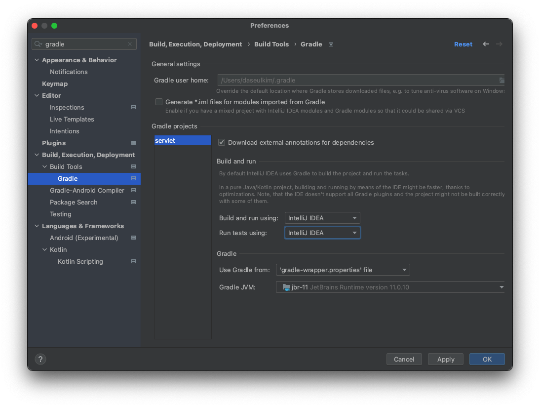 6. 인텔리제이 gradle 대신에 자바로 직접 실행하기 위해 -> preferences에서 옵션을 인텔리제이로 변경