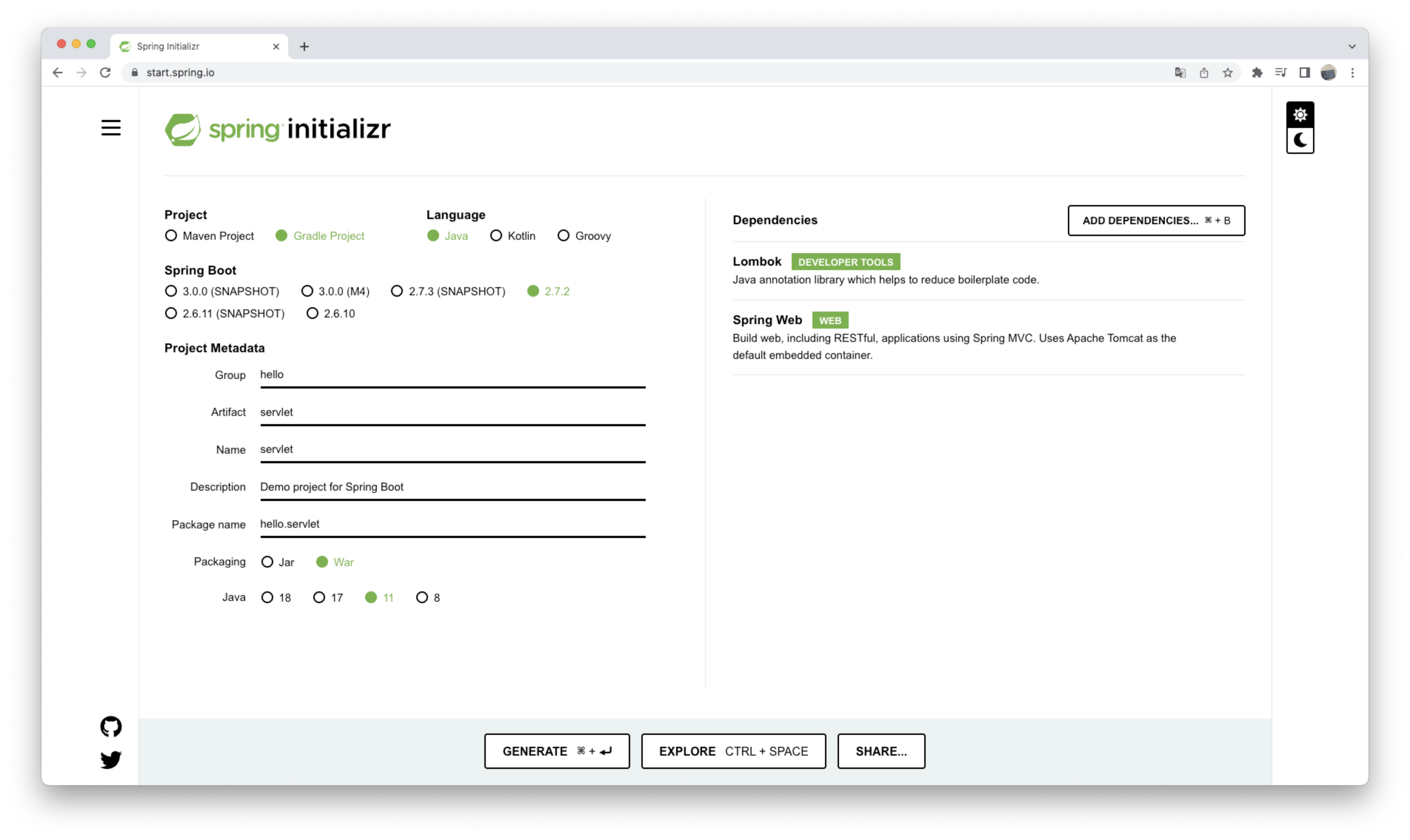 - 스프링프로젝트 쉽게 생성해주는 https://start.spring.io/ 로 접속하여 아래와 같이 세팅하고 Generate 클릭