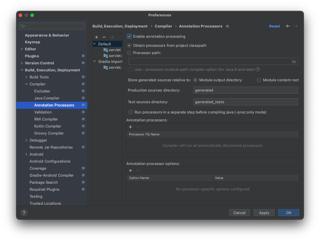 8. lombok이 정상동작 할 수 있도록 preferences -> build -> complier -> annotation process에서 상단의 enable annotation processing 체크