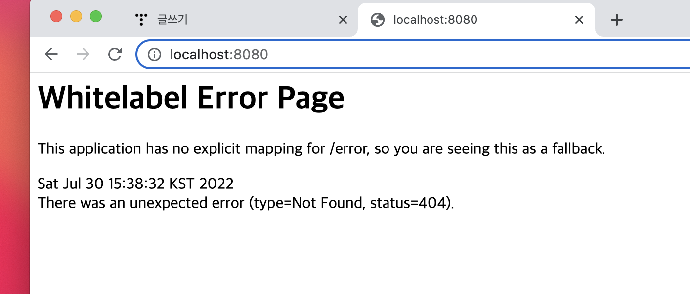 5. localhost:8080 입력 후 접속 whitelabel 페이지 뜨면 성공