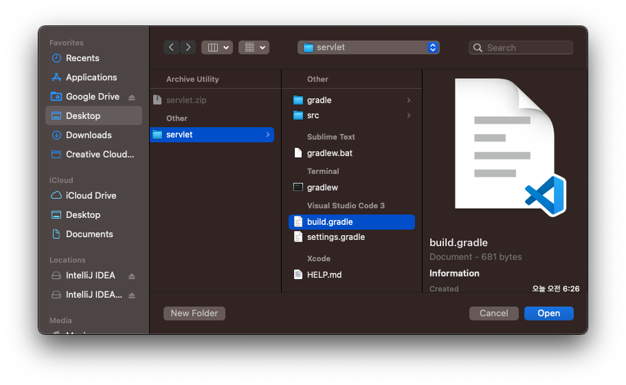 3. 인텔리제이에서 오픈선택 후 servlet -> build.gradle 오픈!